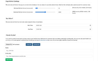 واحدة من الميزات الرئيسية لـ FaceBook Auto Liker هي القدرة على تحديد ساعات محددة خلالها ستعمل الإضافة. يتيح هذا للمستخدمين التحكم في وقت حدوث الإعجاب التلقائي ، مما يضمن أنه يتوافق مع تفضيلاتهم وجدولهم الزمني. بالإضافة إلى ذلك ، تدعم الإضافة تأخيرًا اصطناعيًا قبل تنشيط حدث النقر ، مما يوفر سلوكًا أكثر طبيعية وواقعية للإعجاب.